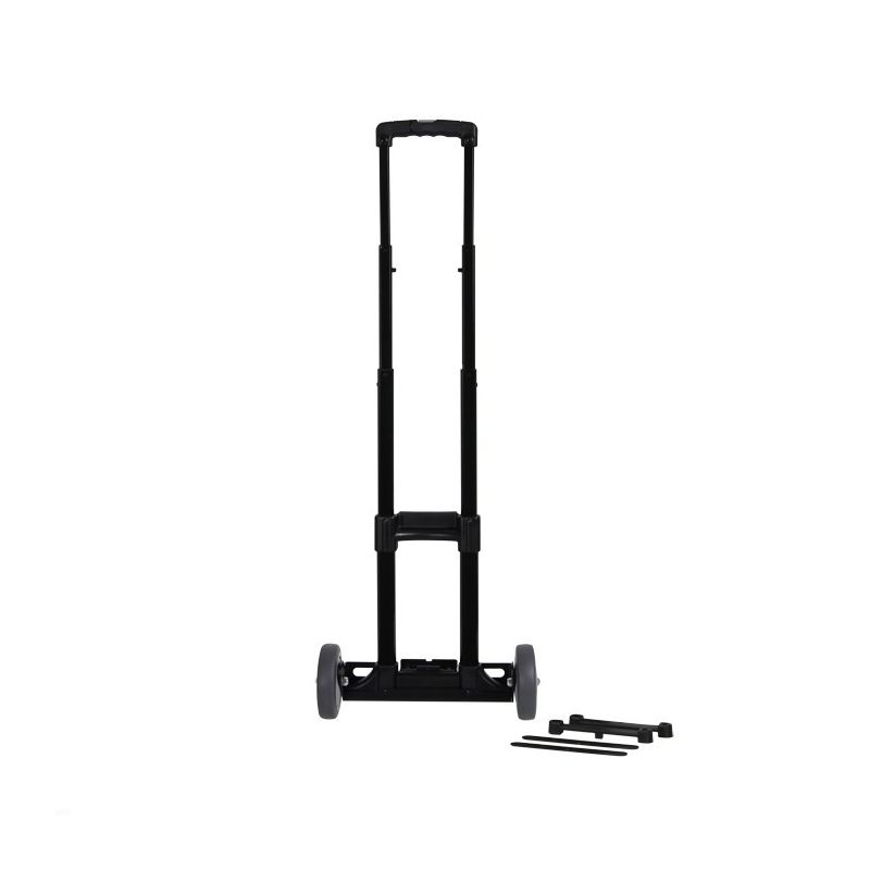 Drietraps uitschuifbaar handvat met vergrendelingsknop op het handvat. Buizen gemaakt van zwart aluminium, handvat en montageplaten van plastic. De wielen met kogellagers zijn bevestigd aan een stevig frame van zwart poeder gecoat staal. De trolley is zeer gemakkelijk te sturen met het handvat dankzij de grote wielen en brede wielbasis. Het handvat klikt in twee bijgeleverde plastic beugels op de koffer.